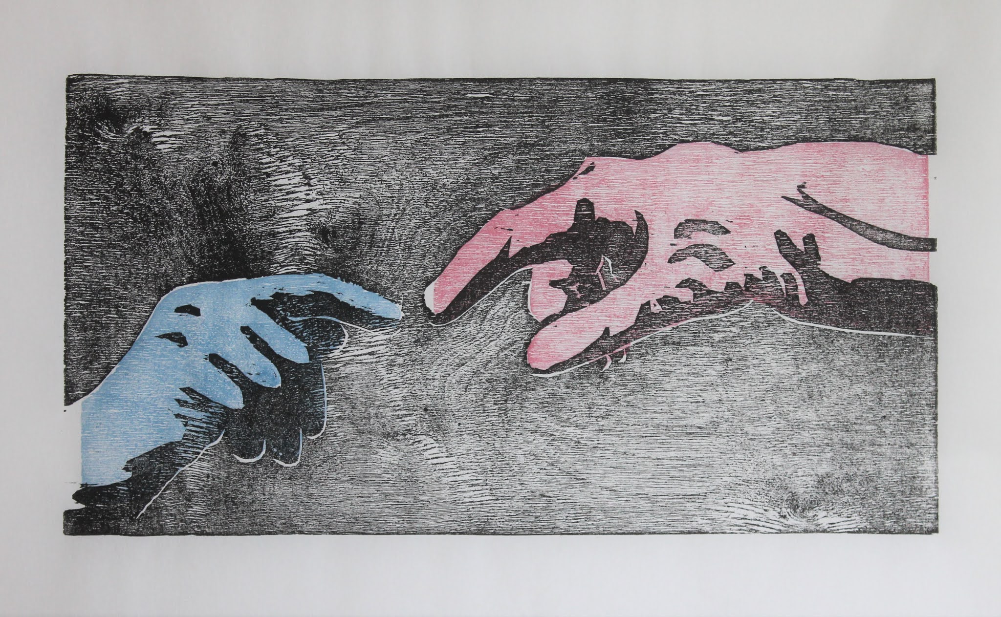 This one is subtitled, “Barrier Methods.” It’s a kind of fugue on my Meditations prints, but bigger. I didn’t look at the Sistine Chapel fresco, because I wanted it to reflect my faulty memory. And my hands. Well, both are my left hand, wearing rubber gloves from under the sink. I knew it was God’s right hand and Adam’s left, but I wanted a degree of equality between the two. So two right hands. This is not God and Adam here. It’s Everywoman and Everyman.